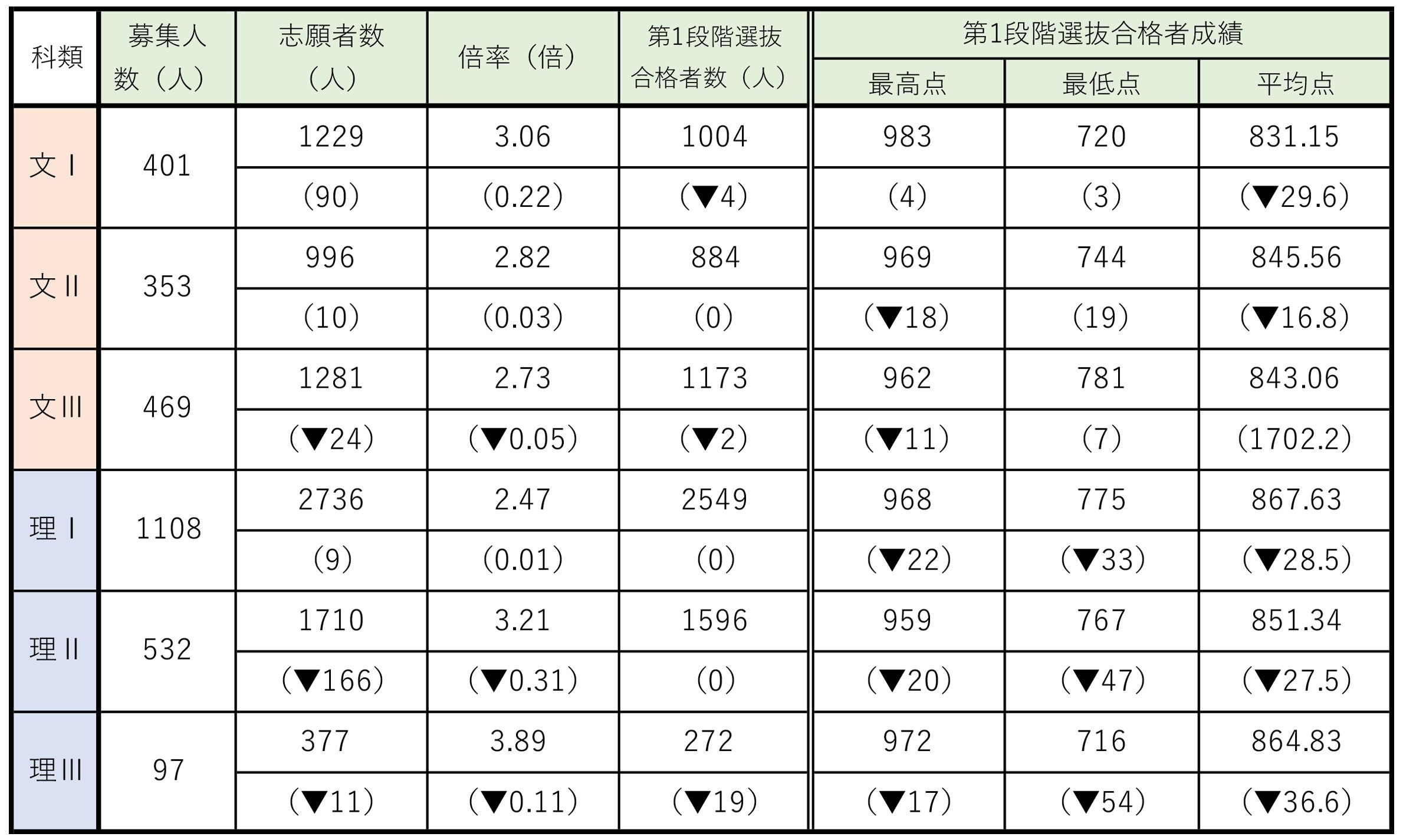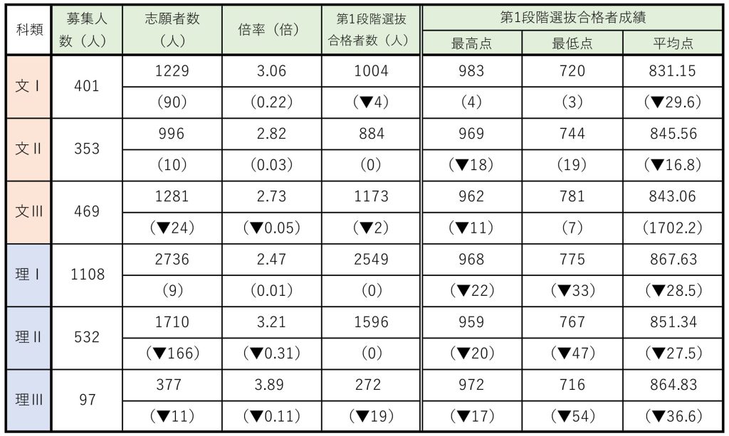 第1段階選抜の最低点は、文科では昨年と比べ全科類で上がった一方、理科では全科類で下がった。特に文Ⅱでは最低点が昨年から19点上がった。最低点は文Ⅲが最も高く781点(1000点満点)だった。