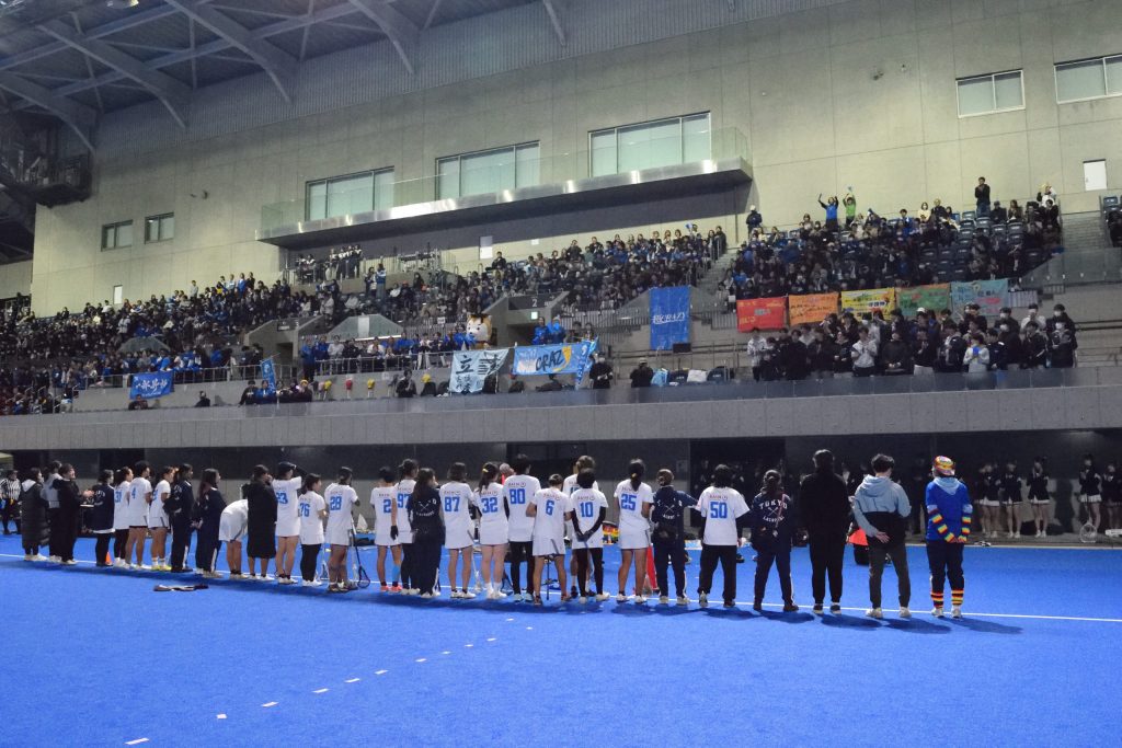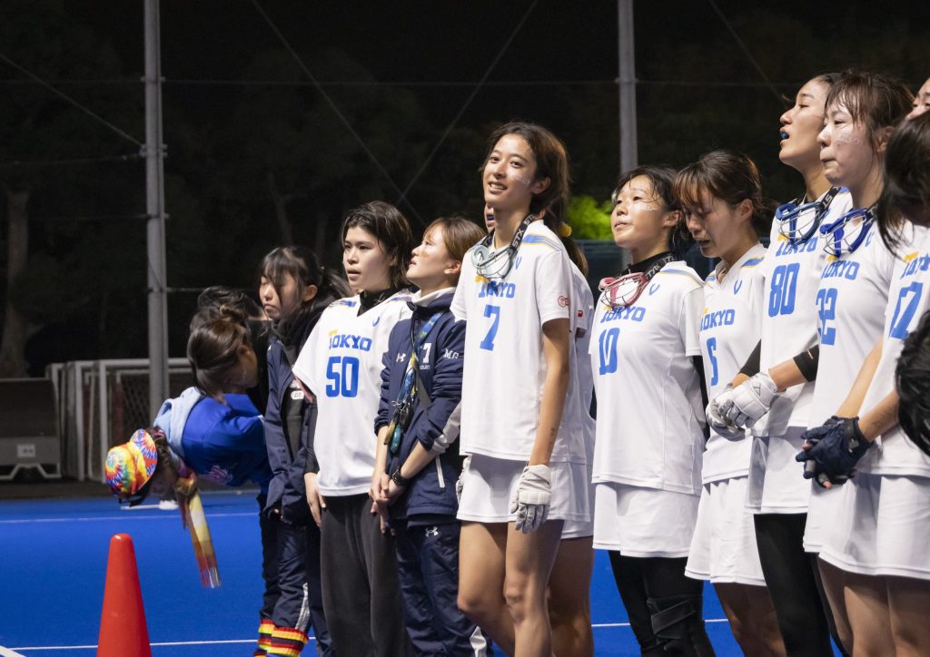 メンバーたちは大勢の青い観客席の前に並び、東大応援部との挨拶をすると、肩を組んで勝利の歌「ただ一つ」を歌った。以上の結果により、東大ラクロス部女子Celesteは1部残留し、26シーズンも1部リーグで戦うことが決定した。来年度以降も挑戦を続けるCelesteへ、変わらぬご声援をお願いしたい。