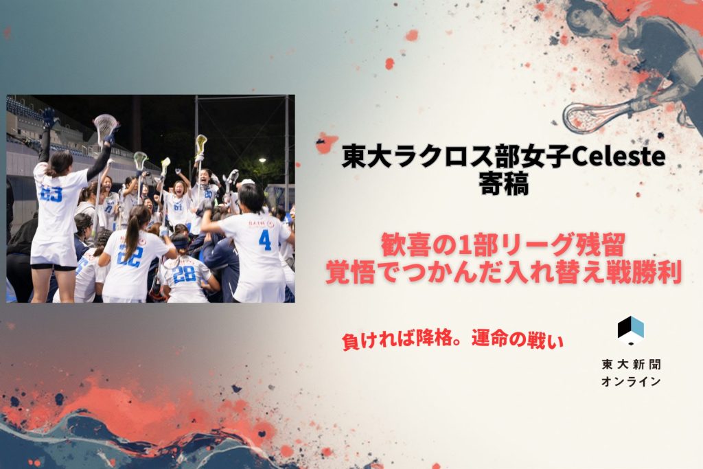 東大ラクロス部女子Celeste(関東学生ラクロスリーグ1部)は11月16日、1部・2部入れ替え戦を戦い、5─4で勝利して1部リーグ残留を成し遂げた。今回は秋季リーグでのチームの状況や、入れ替え戦の様子などについてラクロス部女子に寄稿してもらった。(寄稿=東大ラクロス部女子 吉野ひかり、金原麻友、画像は全て東大ラクロス部女子提供)