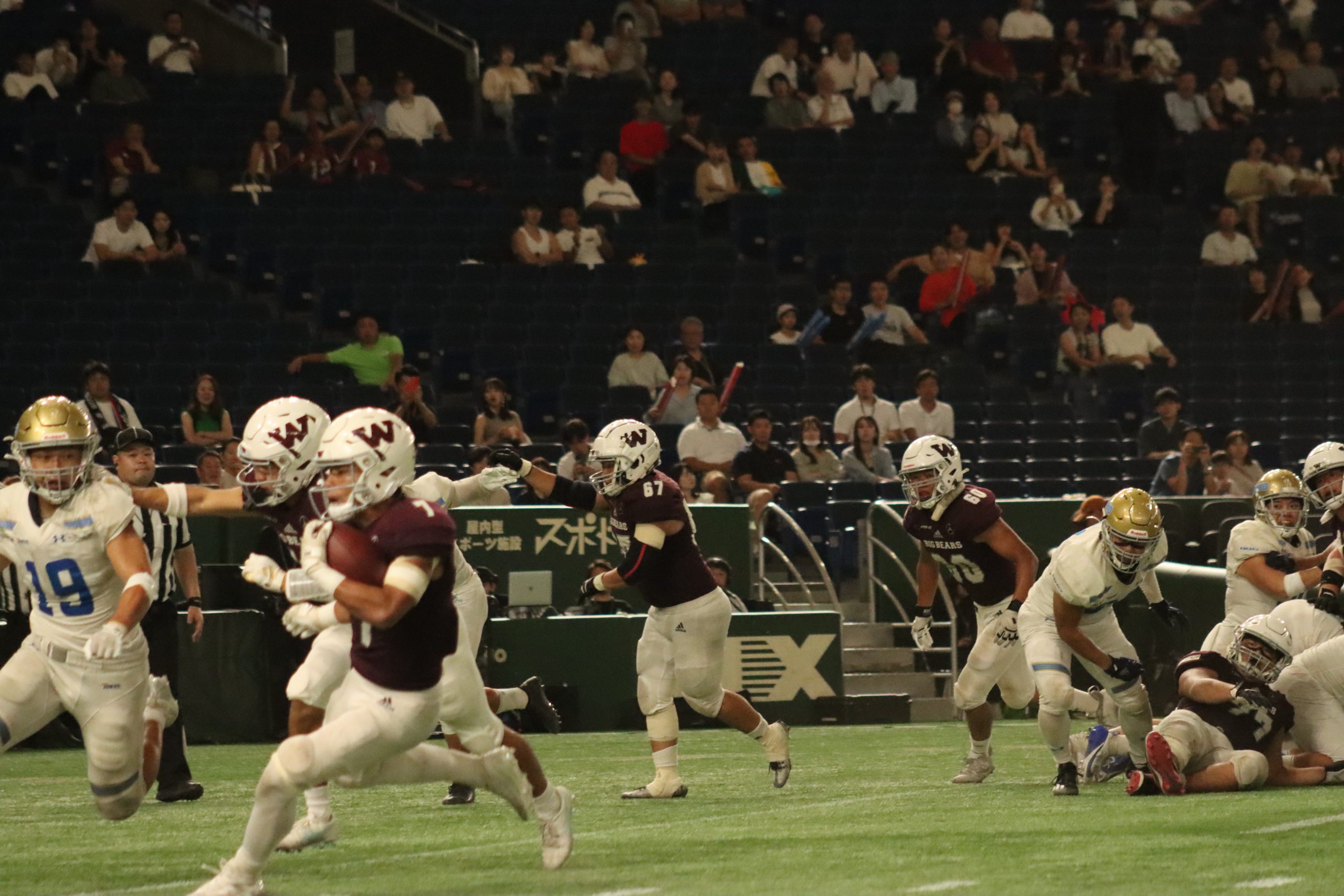 アメリカンフットボール部(関東一部上位リーグTOP8)は、9月21日、早稲田大学と秋季リーグ戦を戦い、3ー24で敗れた。前半は両者譲らない展開となったが、第3クオーター(Q)に東大のミスから早大にタッチダウン(TD)を奪われ、流れを失い厳しい展開となった。年に1度の東京ドーム開催だったが、勝ち星を挙げることはできず、これで秋季リーグ3連敗となった。(取材・新内智之、丹羽美貴、吉野祥生)