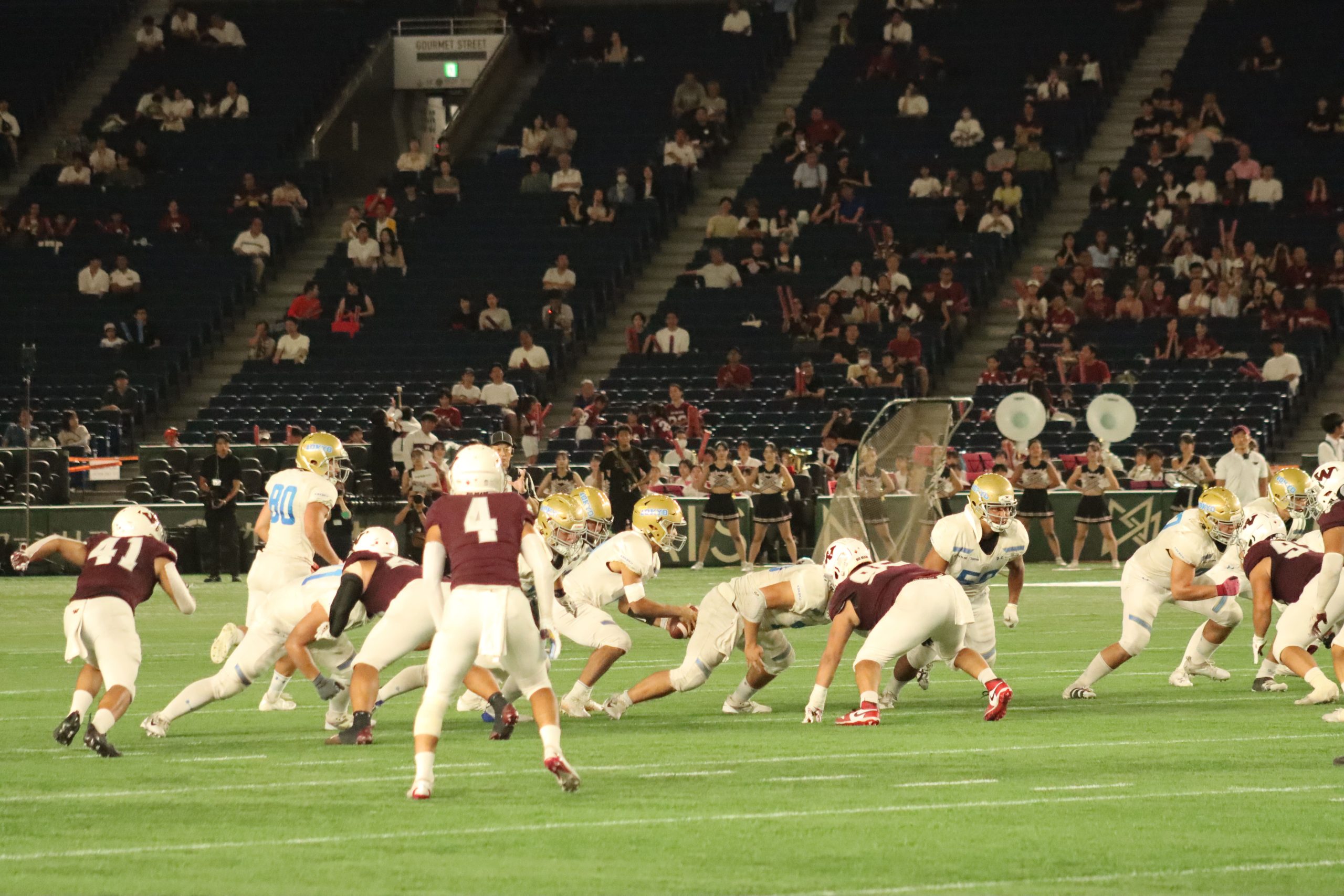 試合前から東京ドームの大型ビジョンを利用した演出が行われ、普段とは違う大一番の雰囲気を醸し出しつつ、キックオフを迎えた。第1Qはラン主体の展開となるが、東大のディフェンスがロスタックルを奪うなど力を発揮し、得点を許さない。一方でオフェンスも相手の堅い守備に阻まれ、フォースダウンとなる。一進一退の攻防はスコアレスのまま終了した。