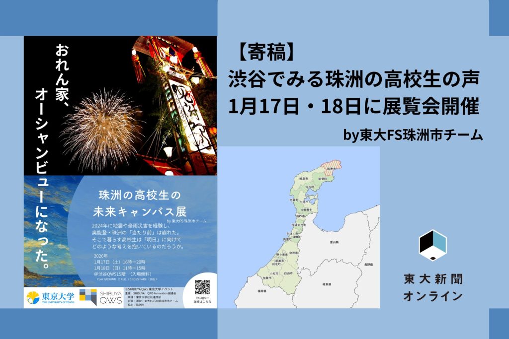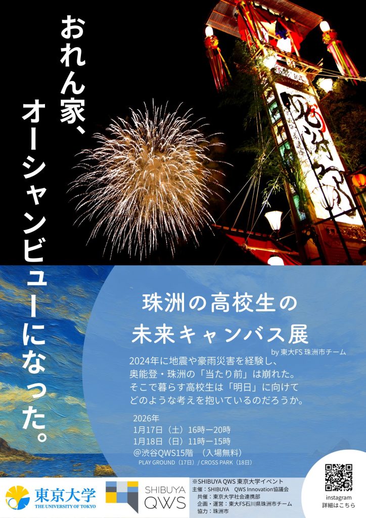 東京大学フィールドスタディ型政策協働プログラム(FS)石川県珠洲市チームでは、1月17、18日にSHIBUYA QWSにてイベント「珠洲の高校生の未来キャンバス展─能登半島先端に生きる高校生はどのような未来像を描いているのだろうか」を開催します。このイベントでは、珠洲市の高校生に対してFS参加学生がヒアリングを通して探ってきた地域や自らの未来像について、高校生の「声」を展示します。また、さまざまなトークセッションを用意しており、珠洲市に生きる人々と来場者の皆さまが双方向的に交流できるものとなっています。イベントを通し、能登について、そして自らの人生について、新たな考え方の視点を持ってみませんか。(寄稿、撮影・東大FS珠洲市チーム)