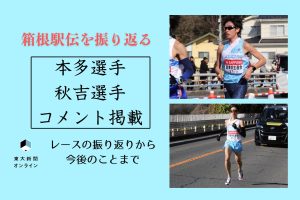 第102回東京箱根間往復大学駅伝競走(箱根駅伝)が1月2、3日に開かれ、陸上運動部の本多健亮(工学系・修士2年)、秋吉拓真(工・4年)がそれぞれ関東学生連合チームとして4区(平塚中継所─小田 … 続きを読む 【箱根駅伝を振り返る】本多選手と秋吉選手のコメントを掲載 レースの振り返りから今後のことまで
