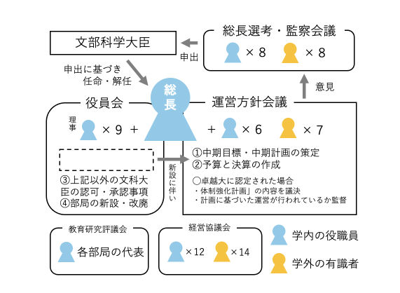 一方で、運営方針会議の設置は東大の自発的な取り組みとは一線を画すものだった。昨年12月の法改正で、東大を含む事業規模が大きい「特定国立大学法人」に設置が義務付けられ(図)、東大は今年9月末に関連する規則を制定した。合議体は学内委員と学外委員が同数の計14人で構成され、学内からは総長、理事3人(うち教学に関する資源配分・財務担当から各1人)と教育研究評議会が推薦した3人の教職員が入る。その他、学外委員には東大の卒業生で代表的な活動を行っている人を充て、女性比率が約5割にするとしている。東大は構成員をまだ公表していない。