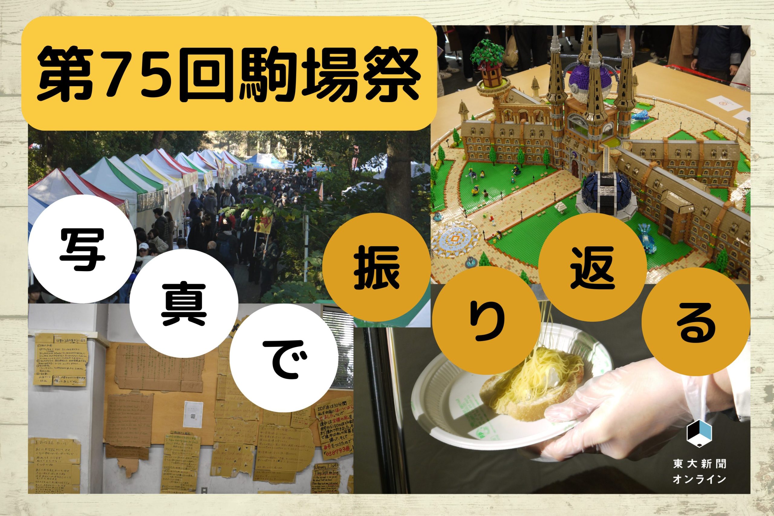 第75回駒場祭が11月22〜24日に駒場Ⅰキャンパスで開催された。駒場祭委員会による3日間で約7万人の来場者が訪れたという。イチョウ色に染まるキャンパスを人々が行き交い、色とりどりの思いが重なり合って生まれるその場限りの出会い──今年のテーマ「彩なす」からは色鮮やかな祭りのにぎわいが連想される。今年の駒場祭はどんな色に染まっただろうか。それぞれの企画の思いとともに、当日の様子を写真で振り返る。 (構成・岡拓杜、取材・渡邊詩恵奈、平井蒼冴、岡拓杜)