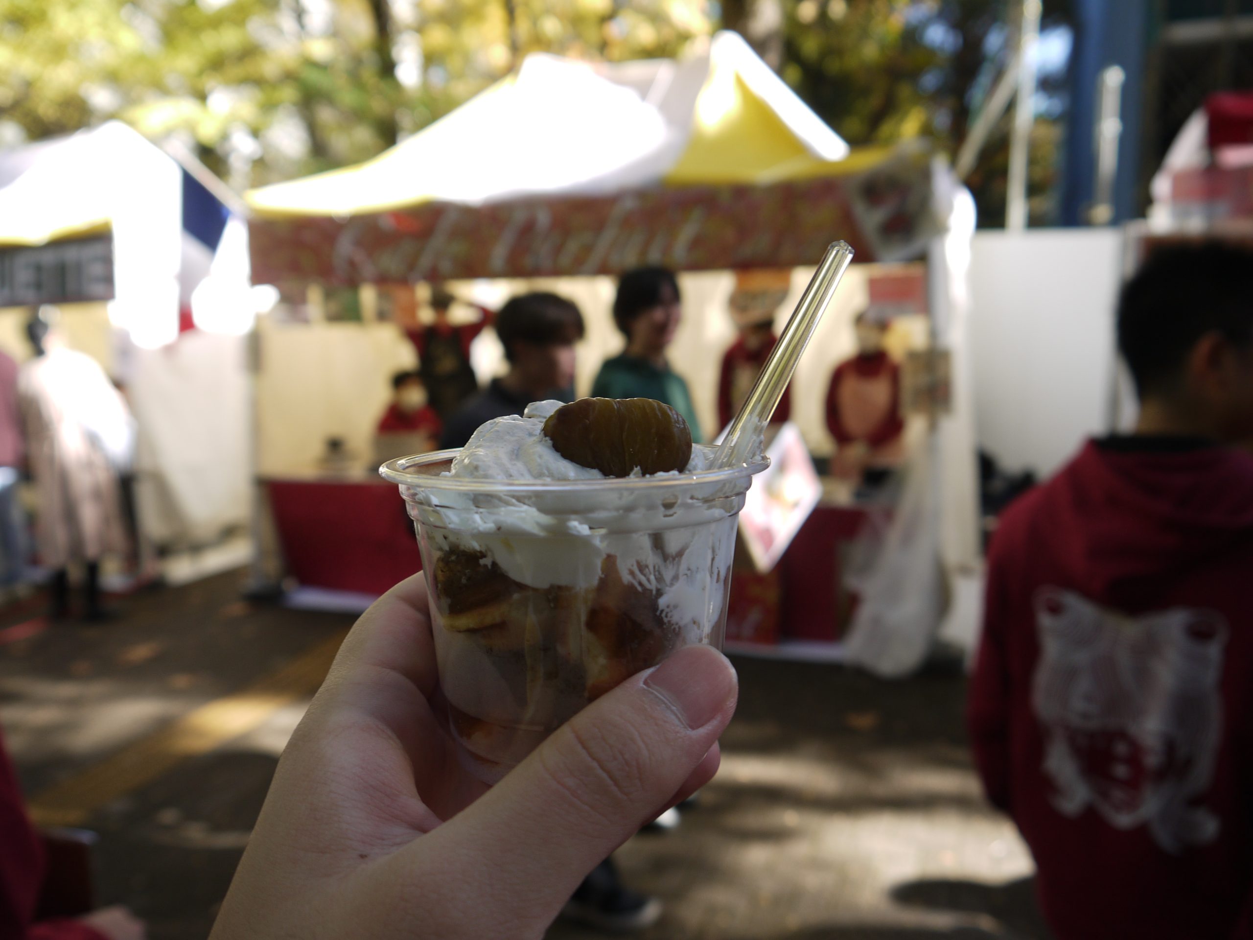 文 I・II27組(24年度入学)は、1号館の西で出店した。提供したのは、ホイップとマロンペーストをのせた鈴カステラの上に、栗を1粒添えたモンブランパフェ。鈴カステラを焼く機材からこだわり、熱々のまま提供できるよう工夫した。今回の出店を通して、クラスの仲が深まり、団結していったという。「秋といえばモンブランということで、みんなに買ってもらえるよう工夫しました」