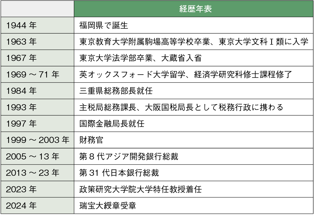 くろだ・はるひこ/東京大学法学部を卒業後、67年に大蔵省に入省。大臣官房調査企画課参事官、国際金融局長などを経て99年に財務官に就任。05年から13年までアジア開発銀行総裁、13年から23年まで日本銀行総裁を務めた。23年より現職。