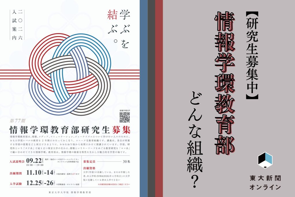 ここまで読んでくださった読者の皆さんは、教育部の雰囲気について少し感じていただけただろうか。2026年度入試の出願期間は11月10日から11月14日正午。東大に在学している学生であれば、受験料や合格後の授業料も支払う必要がない。まさに「入らない理由がない」組織と言えるのではないだろうか。詳しくは東大大学院情報学環ウェブサイトに掲載されている入試要項などを読んでほしい。さまざまな人と交わり、つながる平日午後の教室で、私たちはあなたと一緒に学べることを楽しみにしている。