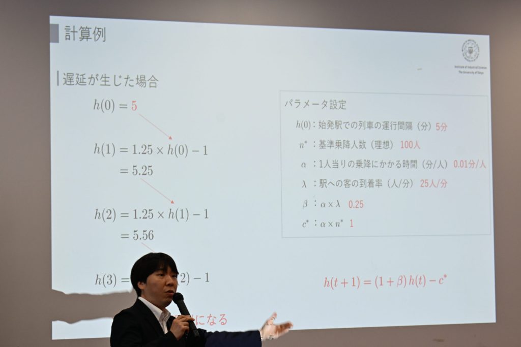 朝9時半。全国各地から集まった高校生の参加者たちが駒場Ⅱキャンパスに集結し、いよいよプログラムスタートだ。緊張する雰囲気もそこそこに、午前中の目玉である本間裕大・准教授(生産研)の講義が始まる。数理最適化を用いて交通施策シミュレーションなどについて研究している本間准教授。今回は鉄道における数理最適化を生かした、「都市と鉄道の『繊細』な関係―システムダイナミクス入門―」というテーマで講義を行う。
