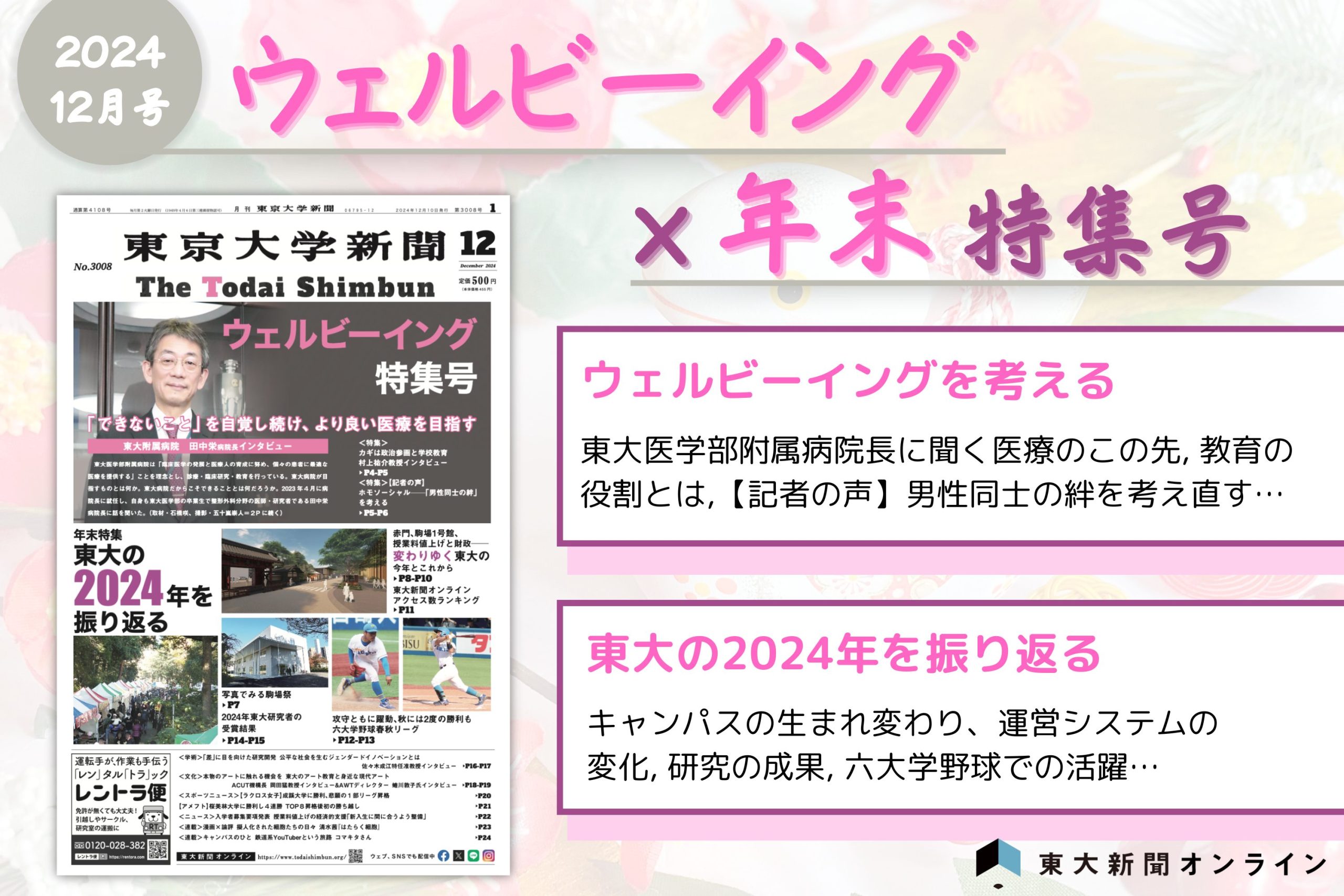 今年も東大新聞をご愛読いただき誠にありがとうございました。東大新聞では例年、12月号を「年末号」と称し1年間を振り返る特集を掲載しています。一方、今年は「年末」と「ウェルビーイング」と二つのテーマを重ねてみました。他にも、学費値上げに関しての社説を出したり、「東大新聞mini」と題した号外を配ったり、「記者の声」という名で編集部員のエッセイを掲載したり…2024年は東大新聞にとって多くの挑戦をする年となりました。