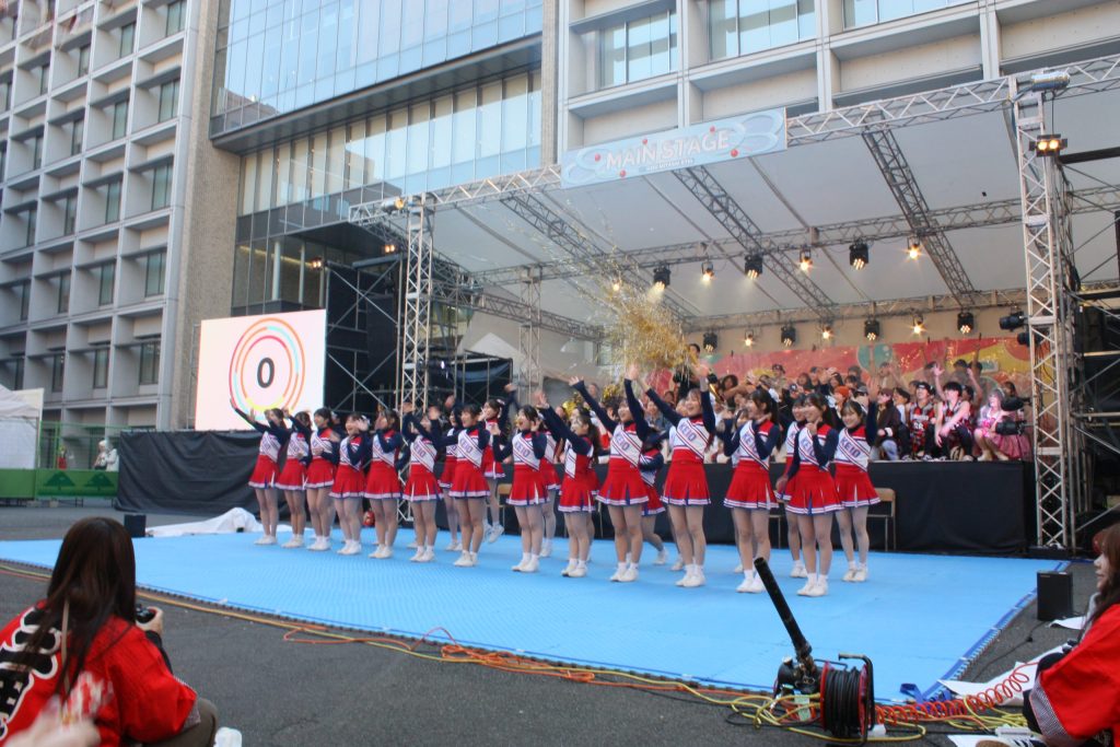 会場をポップな楽曲とエネルギッシュなダンスで盛り上げたのはアイドルのコピーダンスサークル「さよならモラトリアム」。華やかなピンクの衣装で届ける歌とダンスの完成度はピカイチだ。「CheerleadersUNICORNS」はアクロバティックなパフォーマンスが大の魅力。リズムに合わせてリフトやジャンプ、ポーズを決める。チャーミングな笑顔の裏にはきっと計り知れない努力があるのだろう……あまりの迫力と完成度の高さにそう思わざるを得ない。最後を飾ったのはダンスサークル「Dancing Crew JADE」。大学内でも屈指の人気を誇るというこのサークルのダンスも迫力満点。心地良い音楽に合わせ、大勢の部員がダンスを披露。それぞれが自由に楽しく踊っているように見えて、でも全体には統一感がある。これこそが人気たるゆえんなのかもしれない。開幕祭の最後には出演者全員によるパフォーマンス。出演者と観客全員で開幕のカウントダウンをし、一斉にクラッカーを放った。いよいよ今年の三田祭も幕を開けた。なんだか私もお祭りを盛り上げる一員になれた気分だ。
