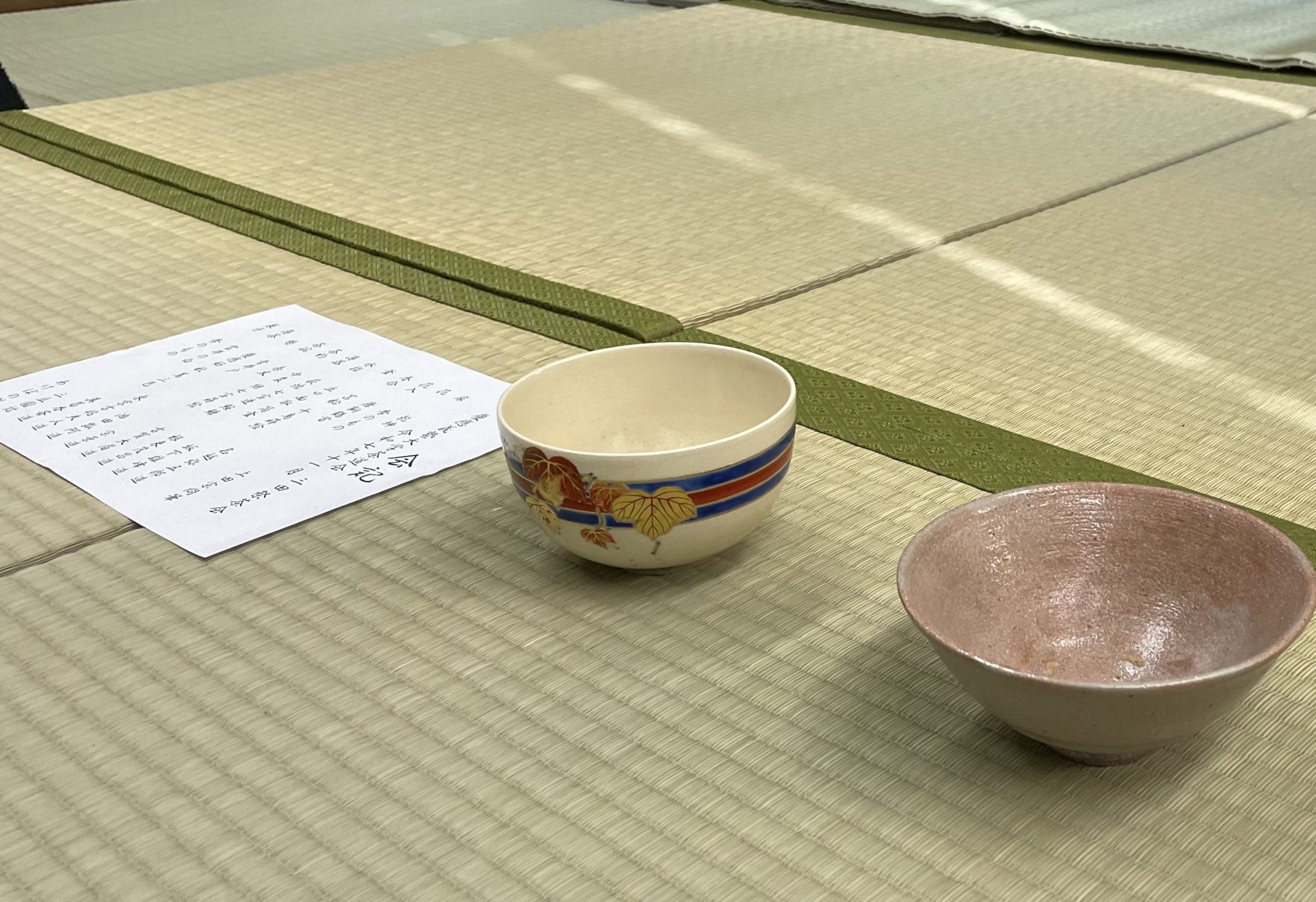 屋内企画をおもむろに見て回る中、私たちの目に留まった企画がある。慶應義塾大学茶道会による「三田祭茶会」だ。部員のお点前を間近で見られる。茶道会には六つの流派が所属し、私たちが参加した茶会では武者小路千家のお点前が披露された。中高時代は表千家に親しんでいた私には流派によるお点前の違いが新鮮だった。三田祭のにぎやかさももちろん楽しいが、茶会の静寂もこれまた心地良い。お点前に合わせて部員から道具や掛け軸などについての説明が加えられた。私のいただいたお茶は、その茶碗の柄に特徴が。慶應義塾大学の三色旗と、秋を感じさせる蔦の葉が描かれていたのだ。お茶会で秋を感じる、とはなんと風情なことだろう、と少しうれしくなる。