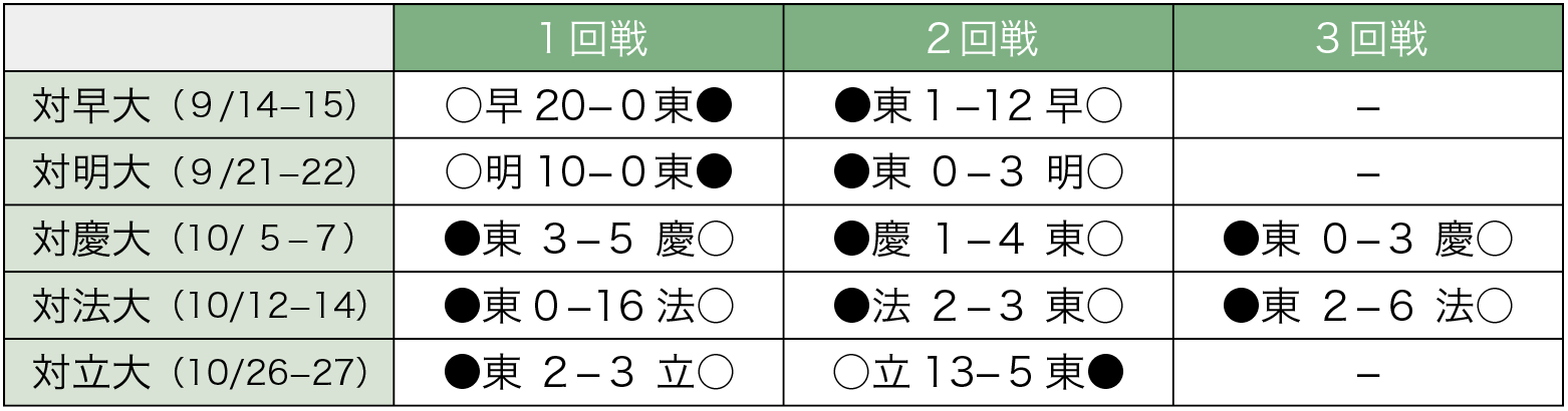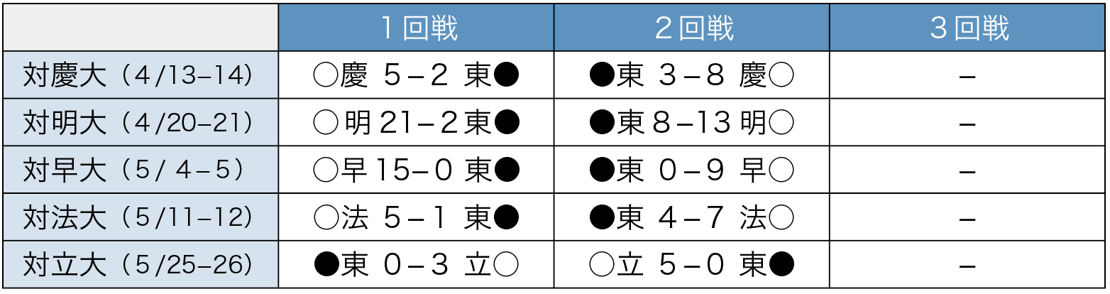 開幕カードの慶大2回戦にて府川涼太郎(文・4年)が早速2ラン本塁打。明大2回戦では初回に大原海輝(文・3年)が3ラン、法大2回戦では杉浦海大(法・3年)がバックスクリーンへ豪快なソロ。大原は春季で打率.333を誇り、ベストナインにも選出された。