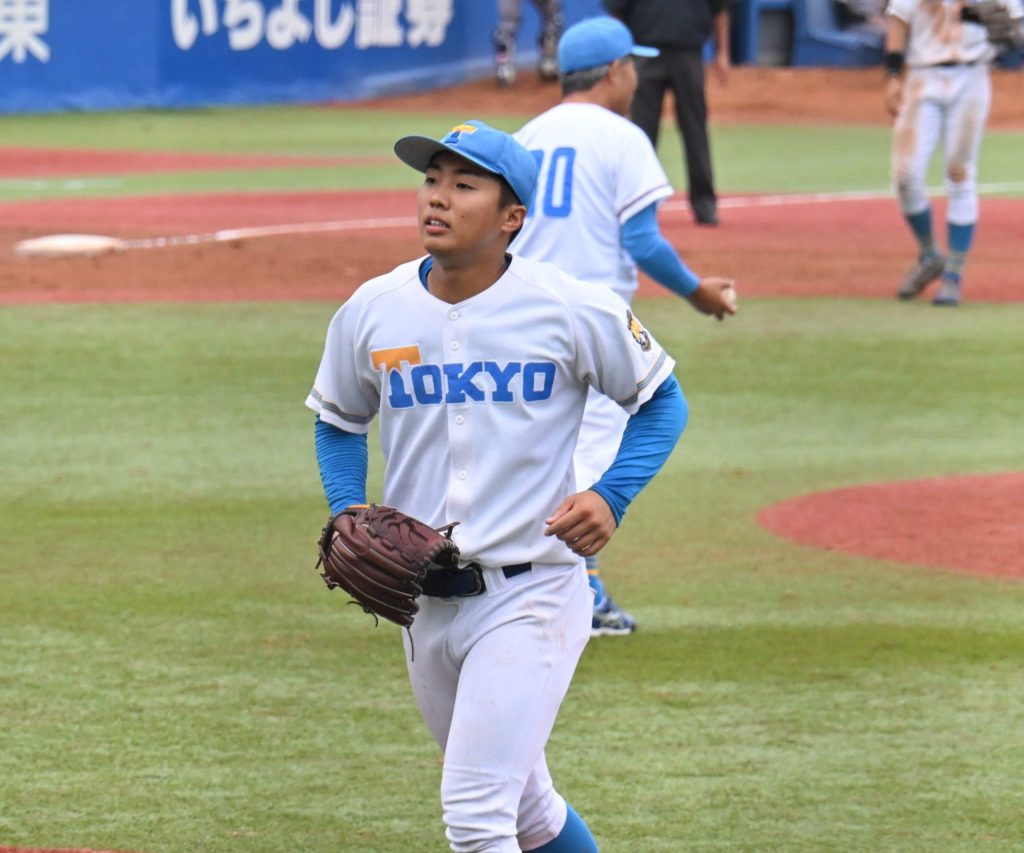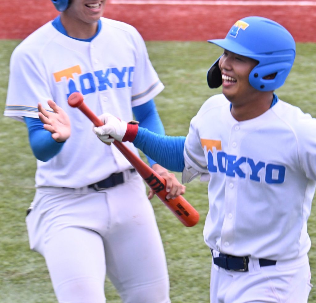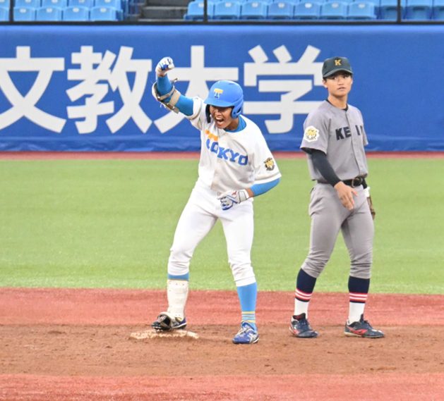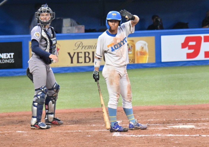 続く打席は、これまで好投を続けている8番・松本。左打ちの松本が引っ張った打球はファースト強襲の強いゴロとなり、捕球によって体勢が崩れた一塁手は本塁に送球できず。この一塁ゴロの間に三塁走者の明石は本塁へと生還し、東大は貴重な1点を追加して1-5と慶大を突き放した。