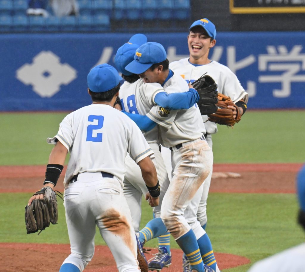 9回表、慶大の攻撃。マウンドには8回に続きエース・渡辺向が立つ。4点リードの状況だったが、先頭の2番・渡辺憩にはレフトスタンドへのソロホームランを浴び、点差は3点に。慶大の底力を感じさせる一発だったが、続く3番はセカンドゴロに打ち取り、1死走者無しで迎えるは4番・常松。この頃には勝利の瞬間を間近で見ようと、多くの観客がバックネット裏や内野席前方に集まっていた。ナイター照明に照らされた雨のグラウンドや最終局面を迎えた試合展開も相まって、場内は幻想的な熱気に包まれる。4番・常松の打球は二塁ベース付近への弱いライナーとなり、センター前に抜けるかと思われたが、ショート・樋口がこれをダイビングキャッチ。ここ一番でのファインプレーに観客席は大きく沸いた。
