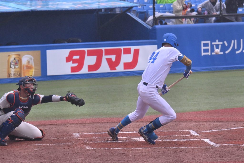 攻略まで時間がかかるかと予想されたが、あっけなかった。先頭の伊藤滉一郎(工・3年)が二塁打で出塁し、好調ぶりを見せつけると、打席に立ったのは2番・明石健(農・3年)。明石も同じく好調なだけに、強硬策も予想されたが、明石は三塁線に絶妙なバントを決める。雨で滑る神宮球場のグラウンド、焦ったかこれを投手・丸山が一塁に悪送球。その間に伊藤がホームを陥れ、あっという間に先制した。