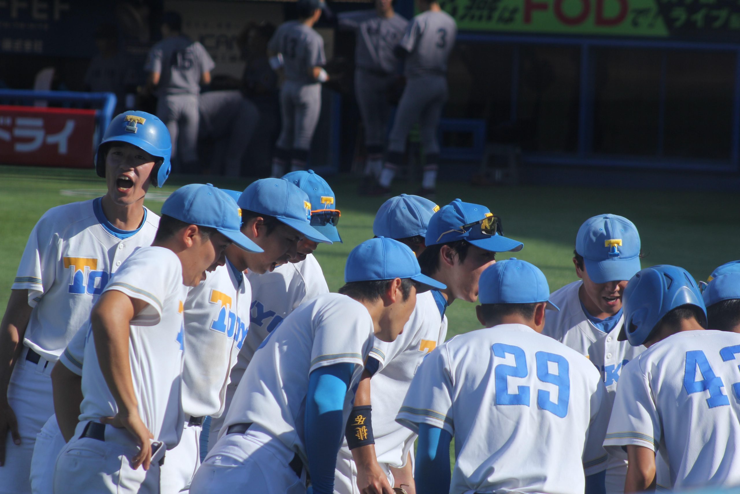 迎えた九回裏、山口がこの日2安打目を放ち気を吐くと、二死から4番・内田開智(文・4年)も出塁。本塁打が出れば同点の二死一、二塁のチャンスで打席に立ったのは、昨季ベストナインながらここまで不調の大原海輝(文・3年)。いつの間にか雲の消え去った快晴のなか、地鳴りのように響く太鼓の律動。それに呼応し、今日一番の大歓声が、追い込まれた大原に浴びせられる。勝負の一球。スタンドの期待感を一身に背負った大原は渾身のフルスイングを見せるも、無情にもバットが空を切りゲームセット。現行ルールでは7年ぶりとなる勝ち点は逃した。