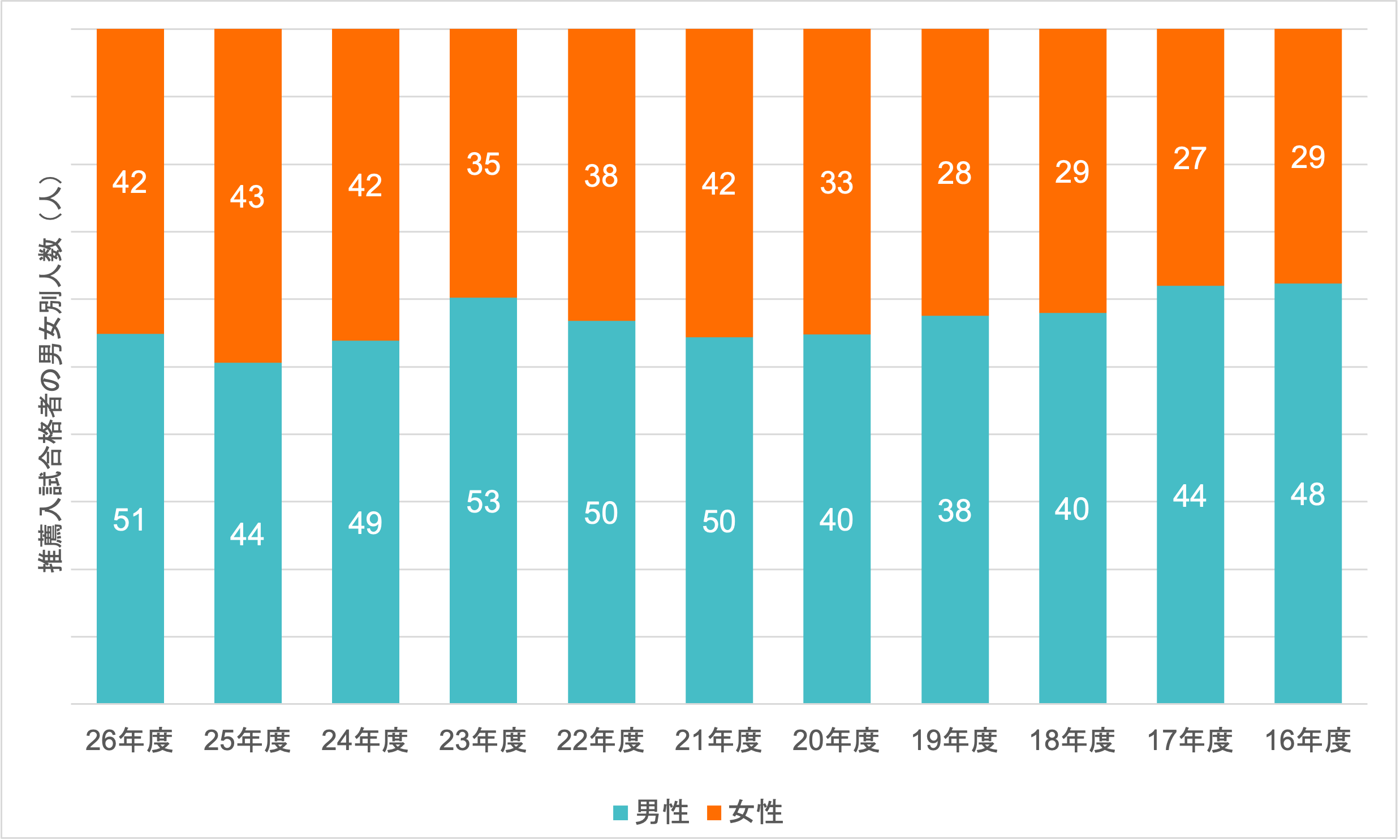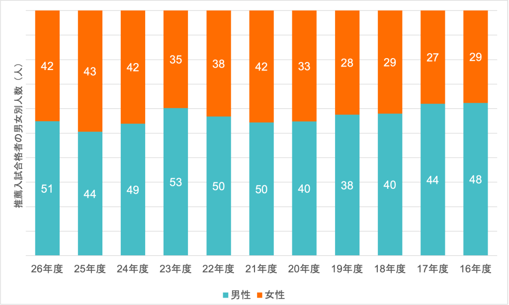 合格者の内訳は男子51人、女子42人(図1)で、女子の割合は45.2%となった。前年度の49.4%からはやや低下したが、推薦入試委員会委員長の村本由紀子文学部長は「全体のトレンドからすると、微減の範囲」との認識を示した。