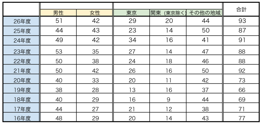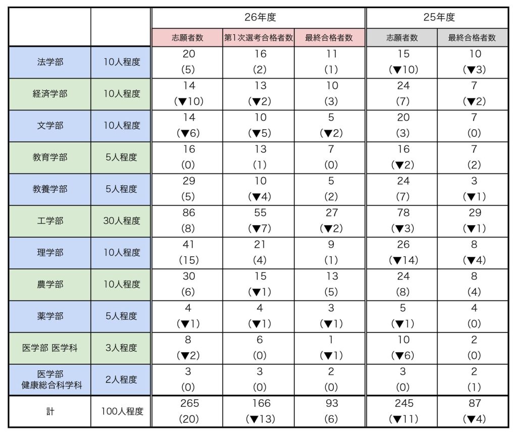 26年度の学校推薦型選抜の志願者数は265人で、第1次選考を通過した166人のうち、最終的に93人が合格した(表1)。