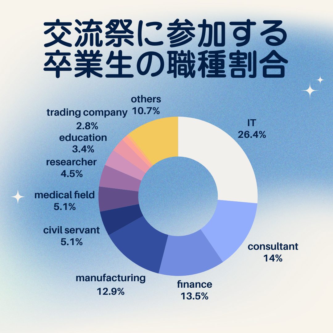 以下のグラフのように幅広い業種のOB・OGに参加いただいております。興味のある業界や仕事について卒業生に直接質問できる絶好のチャンスです!