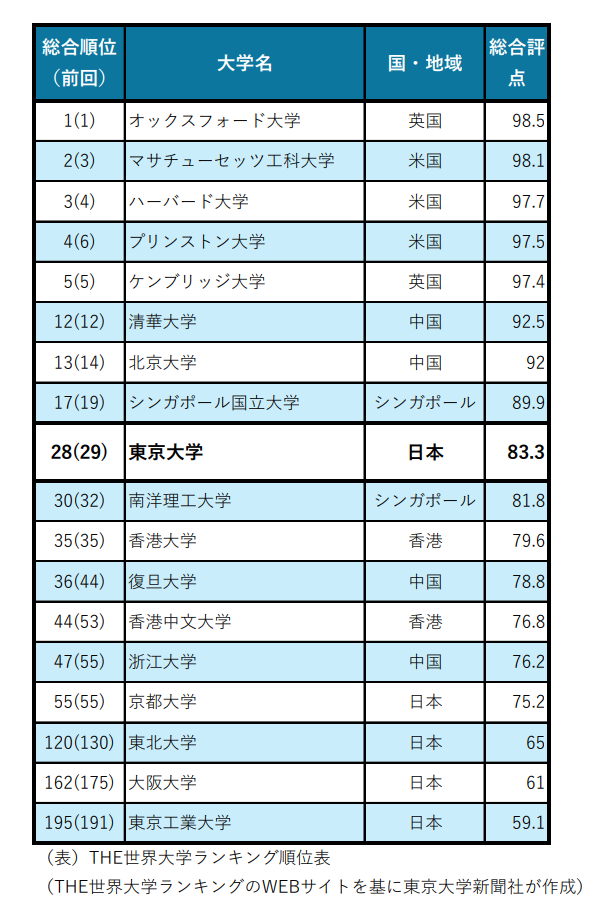 首位は9年連続となる英オックスフォード大学。上位10校は英米の大学が独占した。ブラジル、サウジアラビア、アラブ首長国連邦の大学が新たに上位200校に入った。一方アジアの大学は中国から清華大学(12位)、北京大学(13位)、復旦大学(36位)、浙江大学(47位)、シンガポールからシンガポール国立大学(17位)と南洋理工大学(30位)、香港から香港大学(35位)と香港中文大学(44位)が上位50校に入った。日本からは上位200校に東大のほか京都大学(55位)、東北大学(120位)、大阪大学(162位)、東京工業大学(現・東京科学大学、195位)が入った。