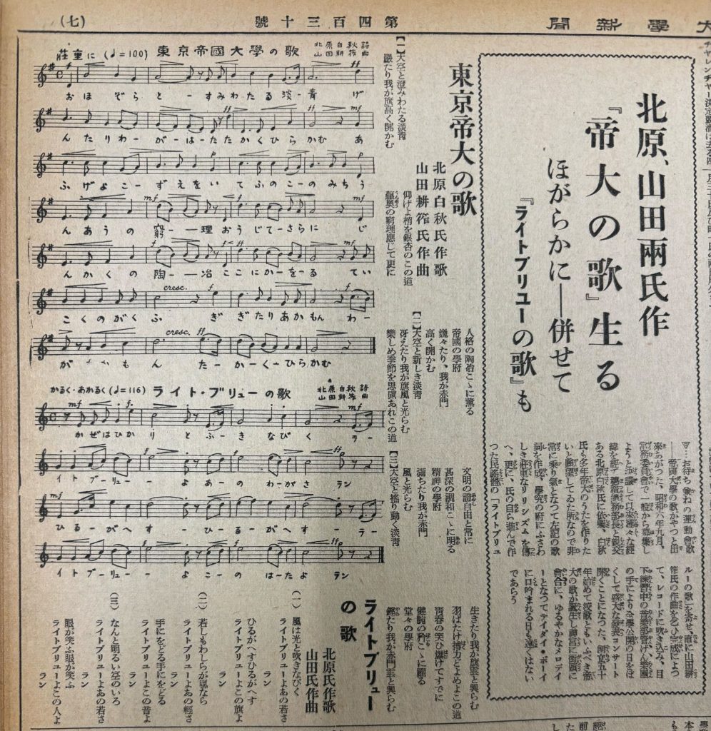 勘の良い読者ならお気付きかもしれないが、初めに募集していたのは「運動会歌」なのに、発表の際には「東京帝大の歌」として発表されていて、まるで校歌のような扱いである。当時の人も気付いてはいたようで、32年5月9日付の『帝国大学新聞』には「『帝大の歌』突如『運動会の歌』と改め手続きの不備のため」という見出しの記事がある。運動会が「大空と」を「帝大の歌」と題して全学生に歌詞を印刷して配布するべく学生部の許可を取ろうとしたところ、学生部長がこの歌を「帝大の歌」とするには手続きの不備があると指摘し、しれっと(?)校歌になることはかなわなかったようである。手続きの不備とはいえ、この「格下げ」に、白秋は後に雑誌上で不満を述べていたようである。