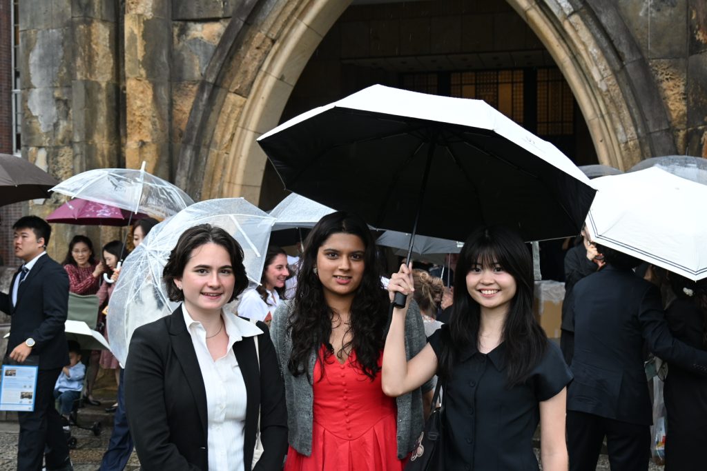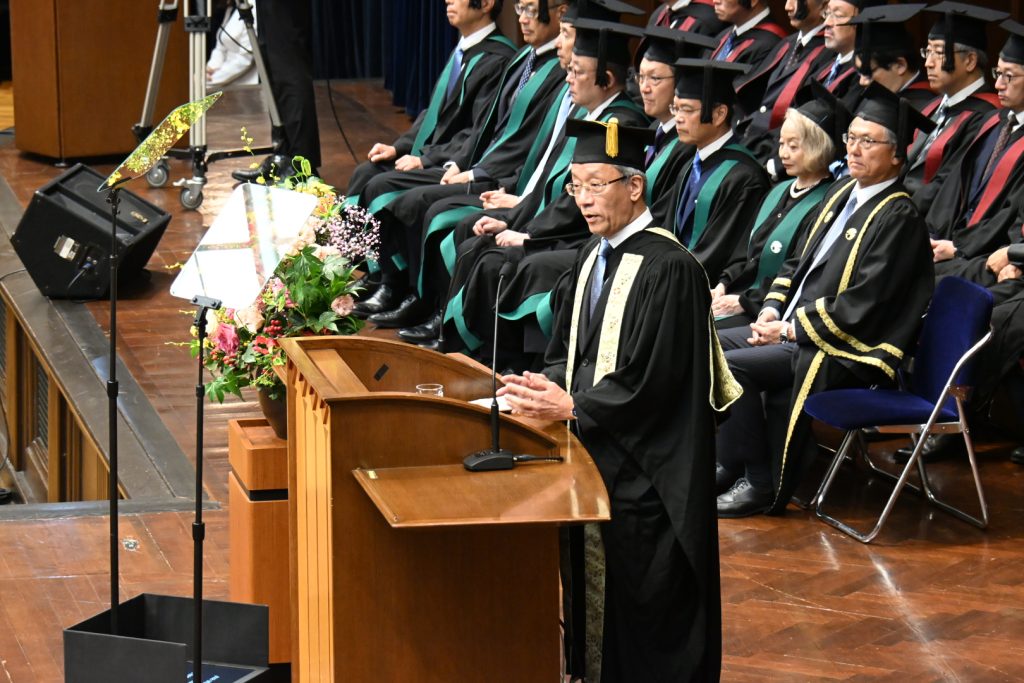 Fujii’s speech was followed with addresses given by the Dean of the Graduate School of Economics, Dr. Makoto Kasuya, and President of the UTokyo Alumni Association, Mr. Takeshi Kunibe. Pledges were then given by two class representatives, Ms. Kumakawa of the Doctoral Program of the Graduate School of Medicine and Ms. Li Xinyue, a first-year PEAK student. The ceremony concluded with the song of UTokyo, “Ōzora-to”, along with “Tada-hitotsu”.