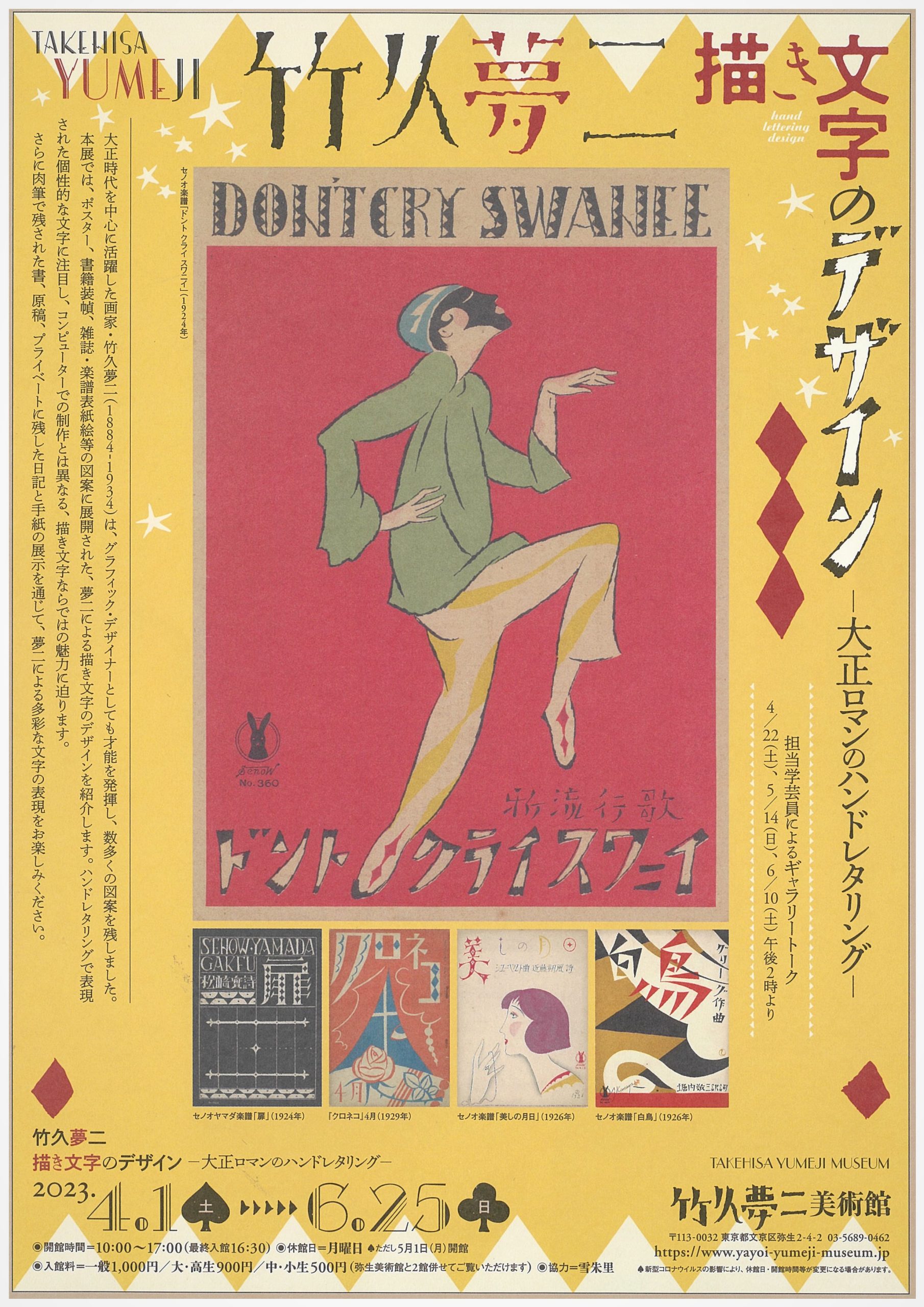 昨夏は、関東大震災から100年という節目に「夢二が見つめた1920年代―震災からモダンガールの表現まで― 」という企画展を行った。関東大震災で被災した夢二は、当時渋谷に住んでいたが、震災の翌日から被害の大きな下町を歩き、変わり果てた街をスケッチしたという。「都新聞」(「東京新聞」の前身)でルポルタージュ「東京災難画信」を連載する など、夢二の目線から震災の記憶を残した。「大正時代の事件や災害、風俗と夢二を絡めた展示は、マスコミからの注目度も高まります」と石川さんは語る。昨春行った企画展「竹久夢二 描き文字のデザイン―大正ロマンのハンドレタリング―」は来館者による SNS への写真投稿が多く、反響が大きかったという。フォントはゴシックや明朝が基本だった時代に、夢二は個性的な文字をデザインし楽譜や本の表紙のタイトルに生 かした。夢二は美人画のイメージが強いが、デザインにおいても大きな影響を与えた。「当館の学芸員は、夢二の仕事や業績を紹介していくことが使命だと思っています」